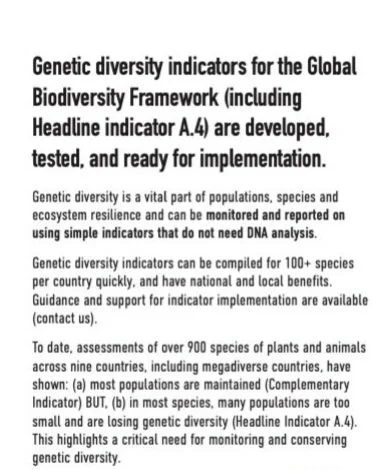 Genetic diversity is vital for population, species and ecosystem resilience. Parties to the CBD are now required to report progress on conserving genetic diversity using indicators of genetic status: